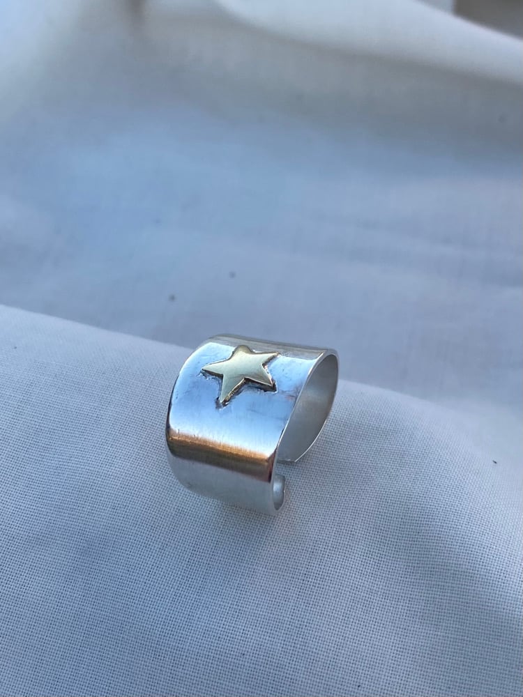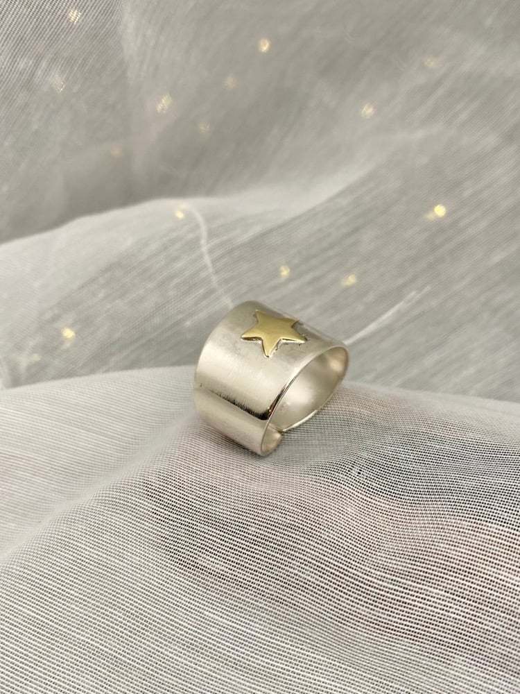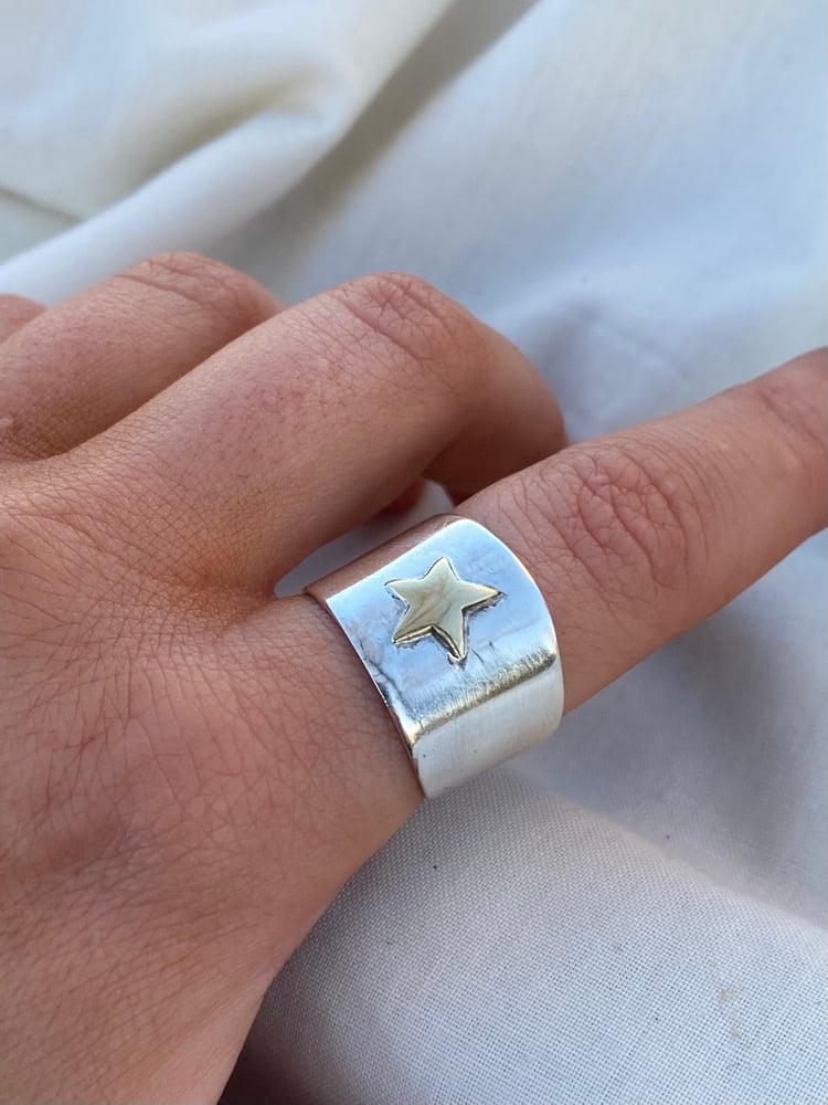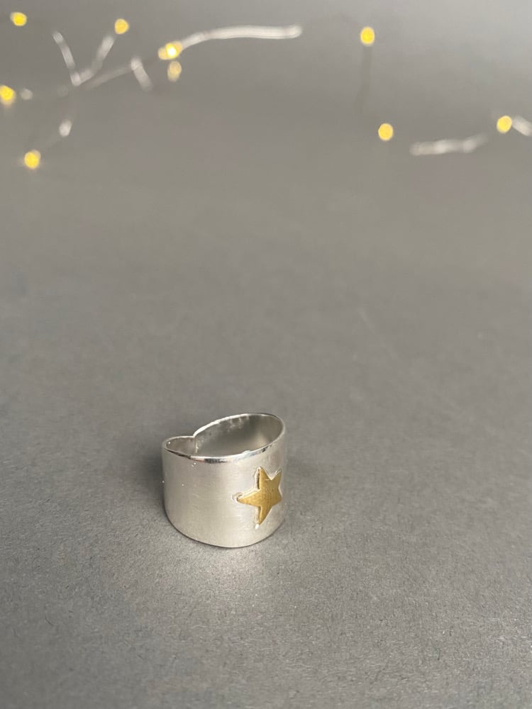Adjustable handmade flat surface ring consisting of precious 925 sterling silver and soldered brass star detail.