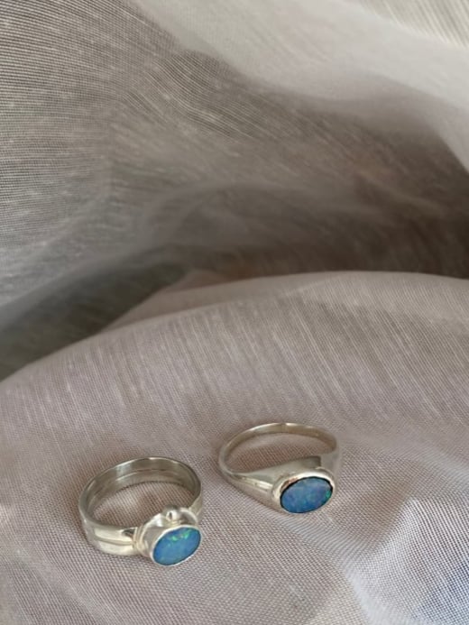 Double banded 925 sterling silver cabochon setting of oval shaped Opal from Ubud in Bali Indonesia. Size N / 6.8 / 54